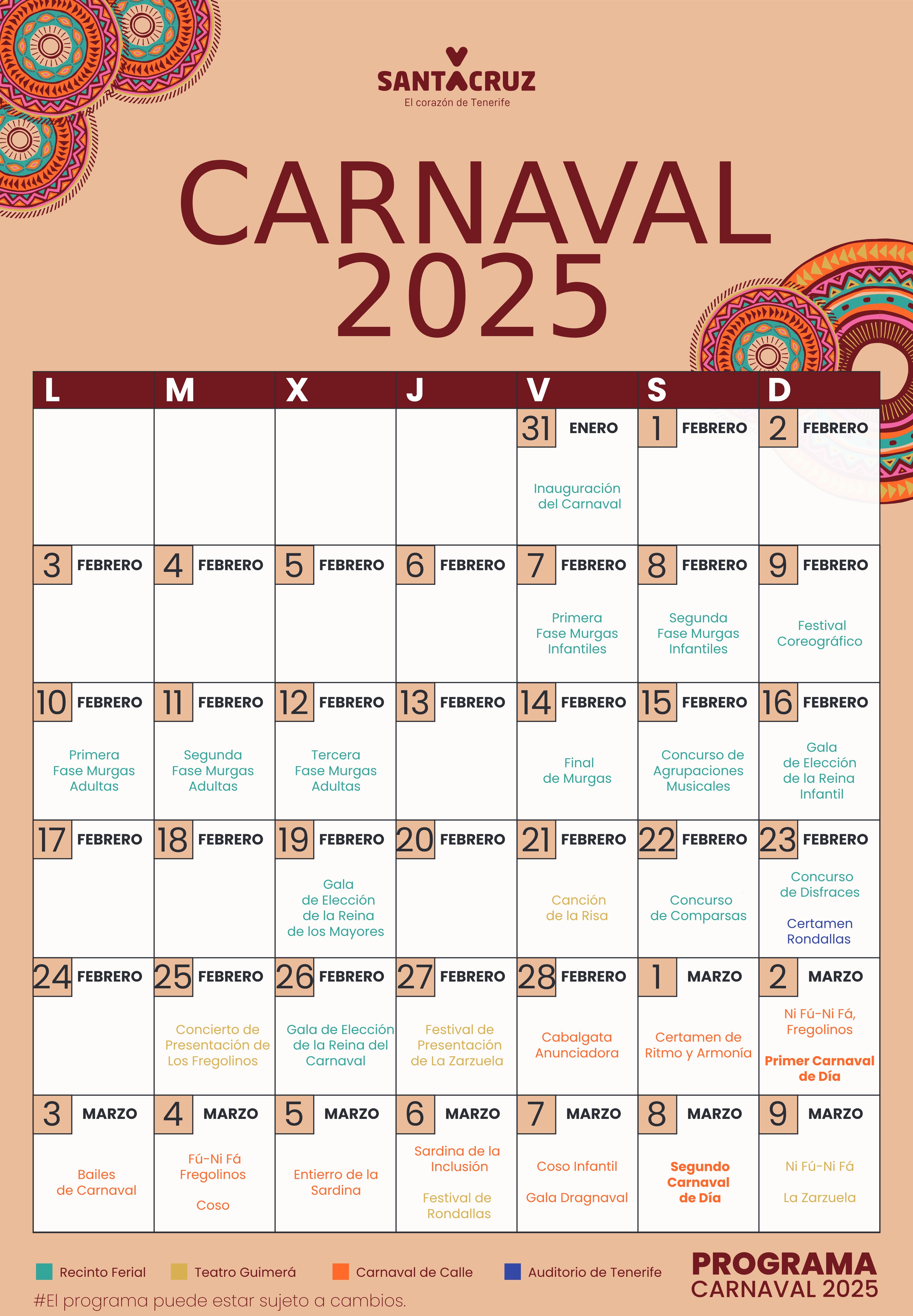 La gala de la reina se desarrollará el miércoles 26 para dar paso al Carnaval en la calle desde el viernes 28 de febrero con la Cabalgata anunciadora. Para los touroperadores o visitantes que quieran programarse las vacaciones de la semana de Carnaval, del viernes 28 al Domingo de Piñata 9 de marzo. En esa franja, hay que reseñar dos días: el carnaval del día del domingo 2 de marzo y la segunda edición de Carnaval de Día, cuando se prevé que actúen los artistas internacionales, el sábado 8 de marzo, siendo la explanada de la avenida de Anaga el punto de encuentro, así como el cuadrilátero.